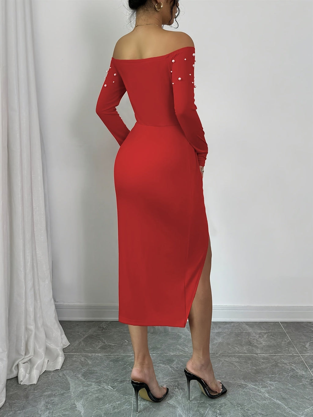 Crafted with premium materials, this pearl embellished one-shoulder dress offers a flattering silhouette that hugs your curves in all the right places. The long sleeve design provides elegance and warmth, perfect for evening events or formal gatherings.
