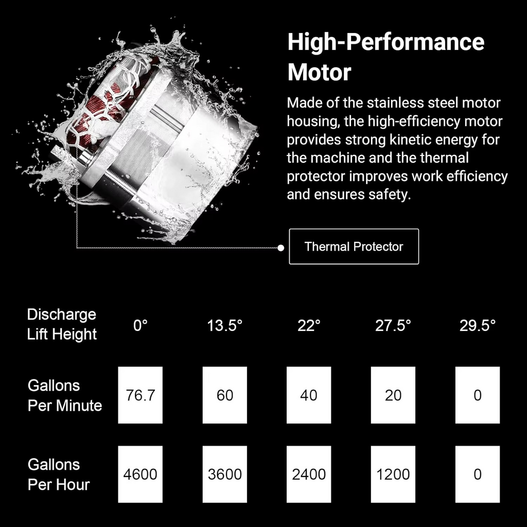 This pump delivers an impressive capacity of 4600 gallons per hour, making it ideal for both residential and commercial use. Its powerful motor handles large volumes of water effortlessly, providing peace of mind during heavy rainfalls or flooding.