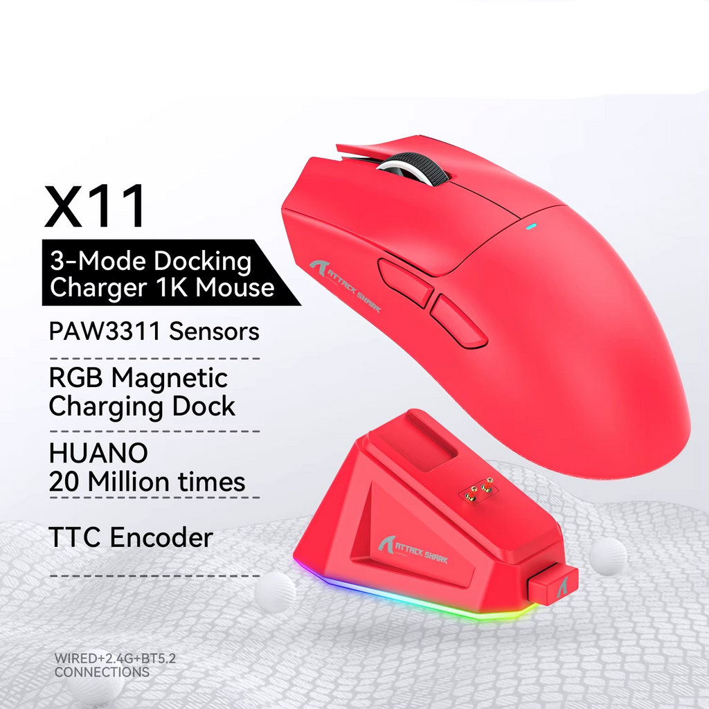 The Attack Shark X11 is the ultimate blend of speed, customization, and wireless freedom. Featuring a featherlight 63g build, high-performance PAW3311 sensor, and three versatile connection modes—wired, Bluetooth, and 2.4G wireless—this gaming mouse delivers elite responsiveness for gamers and professionals alike. Designed for extended gameplay, it includes a magnetic RGB charging dock and tactile HUANO switches rated for 20 million clicks.