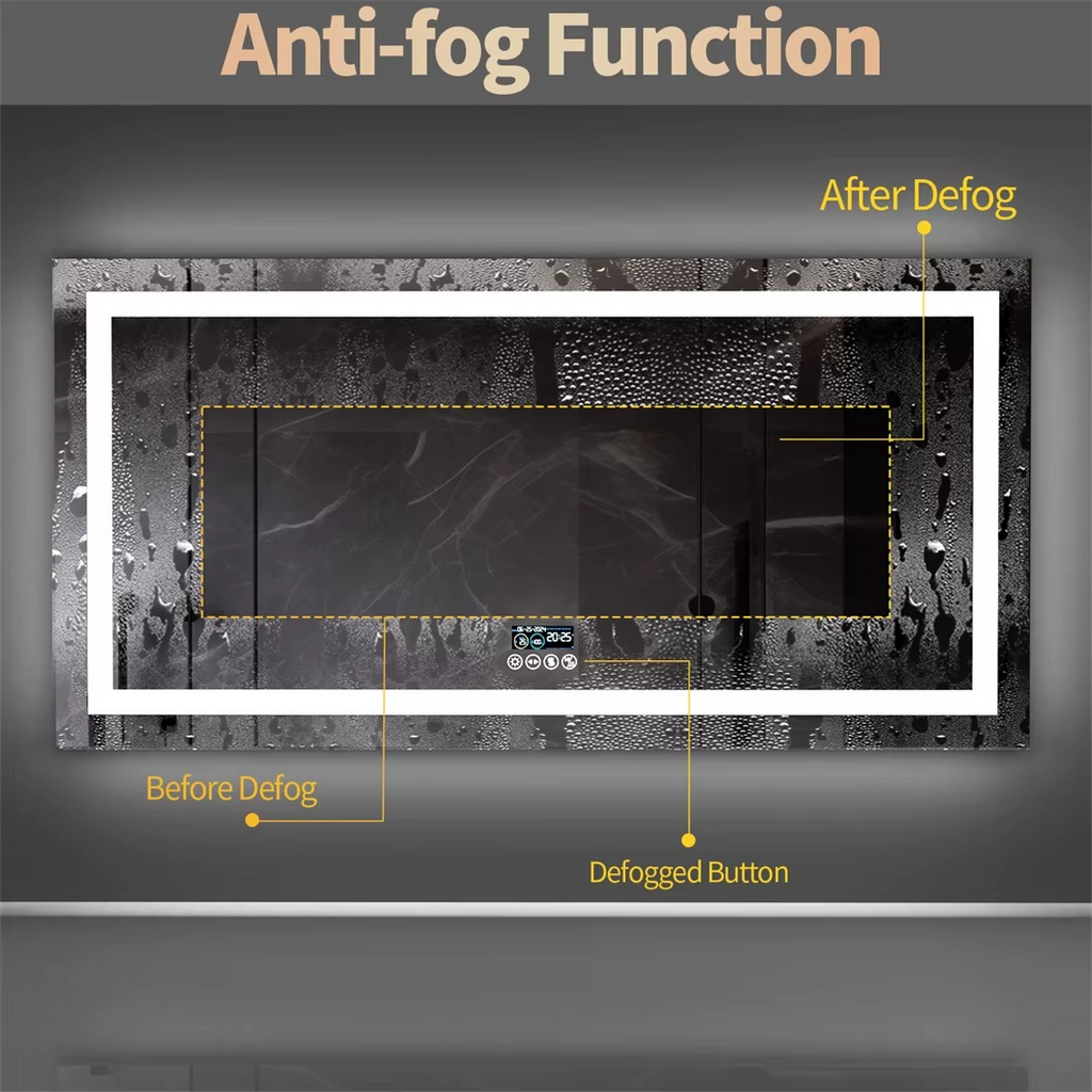 Say goodbye to foggy reflections with our anti-fog feature. The XXL smart vanity mirror with Bluetooth maintains clarity, ensuring your reflection is always perfect, even after hot showers. This wall-mounted marvel is a sleek addition to any bathroom decor, combining modern technology with timeless style.